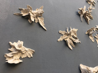“The viewer is confronted by what appears to be a flock of white doves that have flown directly into the wall. There is an ambiguity between the recognizable bird anatomy and the plant forms such as orchids and varying foliage that make up each amorphous shape on the wall. For this new body of work I continue to tap into the cultural symbolisms associated to white birds (freedom, purity, innocence) and the narrative of what it means for them to have flown directly into a wall. But I am more interested in what happens next, through time these birds begin to decompose, their transformation gives nutrients for new growth. I am contemplating the literal and the metaphorical transferring of energy from one body to another, nourishing new life. These Bird Botanicals are neither one nor the other, they are captured in an optimal state of chemical potential in space, time and matter.”